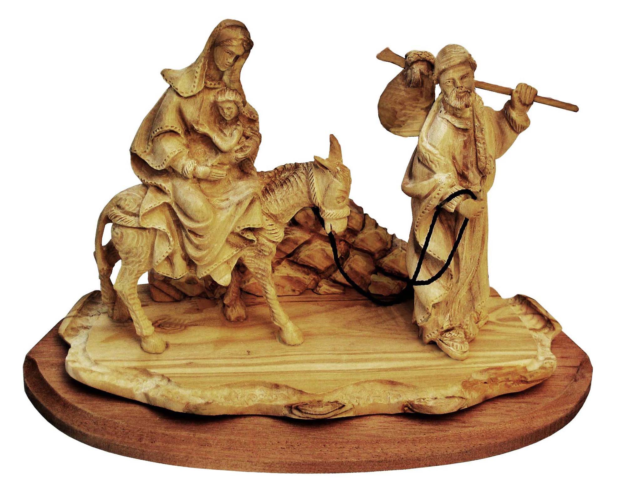 This olive wood handcraft piece is made by Christian people from Bethlehem the holy land Showing Mary with the baby on a donkey, led by Joseph and going into Egypt. It is a unique piece that shows the non-Biblical subject of the Holy Family.